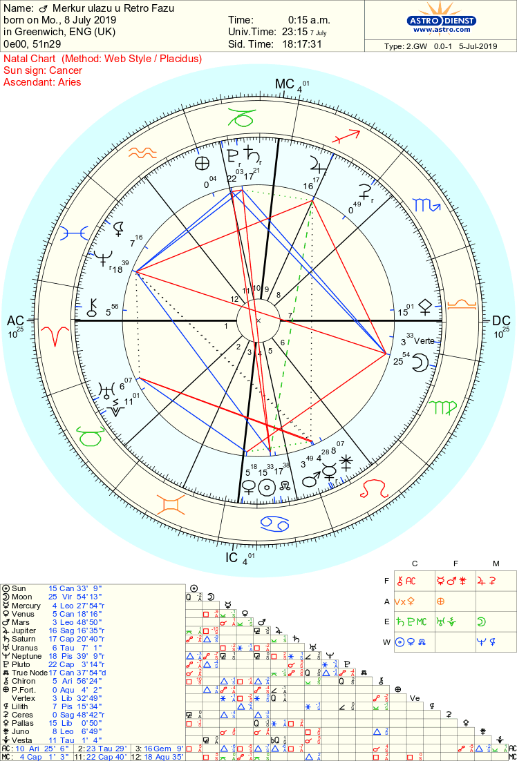 MERKUR polako ulazi u retro fazu, u svoju retro stanicu, na 4,25,7 stepeni znaka Lava; 8.7. biće na 4,27,9 st. a zapravo kreće retro hodom 9.7.2019 sa 4,25,4 st. Lava, i dolazi ponovo u konjunkciju sa MARSOM u Lavu.